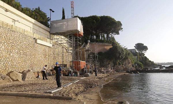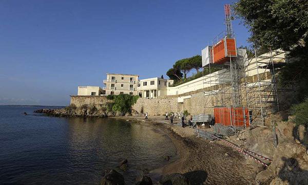 نصبت منصة أسمنتية على الشاطئ لوضع مصعد مؤقت أمام فيلا الملك