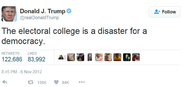 والغريب أن ترمب الذي فاز بأصوات ‘المجمع الانتخابي، لا شعبيا، كان حتى آخر لحظة من يوم الانتخاب نفسه، أكبر معاد لدستورية المجمع نفسه ومنحه حق انتخاب الرئيس، ونجد أعلاه تغريدة ‘تويترية’ أطلقها في حسابه يوم 6 نوفمبر 2012 يصفه فيها بأنه ‘كارثة على الديمقراطية’ وأعاد تغريدها أكثر من 122 ألفا من ‘التويتريين’ وحوالي 84 ألفا أبدوا إعجابهم بها.. ترمب، نسبة لأنصار كلينتون، كان محقا، فالمجمع كارثة على الديمقراطية فعلا، وأكبر دليل أنه جاء به رئيسا.العربية نت