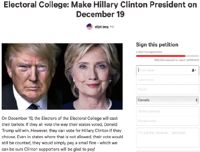 الحملة الهادفة لجمع 4 ملايين و500 ألف توقيع، جذبت حتى أمس السبت 3 ملايين عبر موقع Change.org وفق تقرير أطلعت عليه ‘العربية.نت’ بموقع شبكة Fox News التلفزيونية الأميركية، وهو من إعدادها، وقالت فيه إن موقعا آخر اسمه Faithlessnow.com يجمع أيضا تواقيع الراغبين بتحريض الممثلين في ‘المجمع الانتخابي’ للولايات التي فاز بها ترمب، على تغيير أصواتهم التي حصل عليها تلقائيا حين فاز شعبيا بتلك الولايات، بحيث يتم تجييرها لصالح هيلاري كلينتون، وهي مهمة صعبة، لأن المندوبين لن يسبحوا ضد التيار ويمنحوا أصواتهم لمن لم تصوّت له ولاياتهم، كما أن على الواحد منهم دفع غرامة ليست كبيرة لتعديله صوته، وهي ليست مشكلة، لأن المناصرين لهيلاري أعلنوا عن رغبتهم بدفعها عن المغيّر صوته لصالحها.