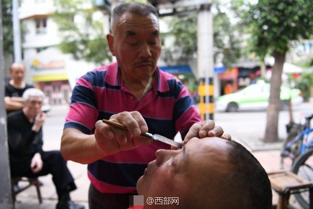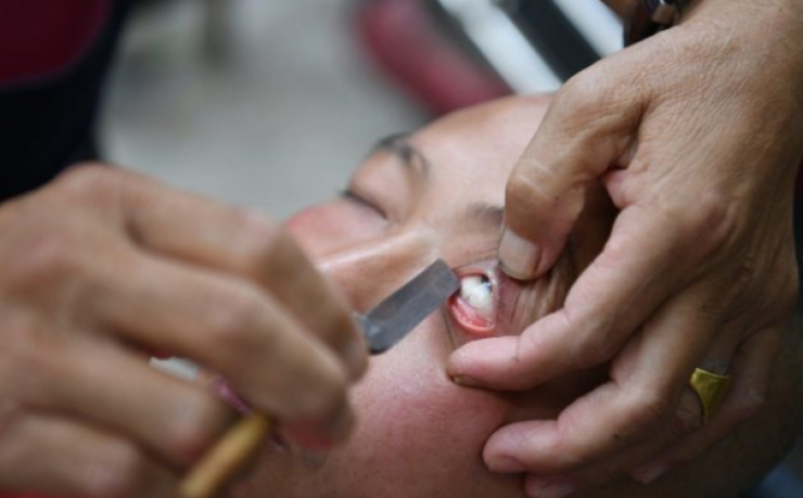 يستطيع عجوز يمتلك متجراً صغيراً في الصين تنظيف العيون باستخدام شفرة حادة.