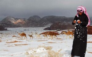 ففي مشاهد غير اعتيادية تجمع بين سفينة الصحراء وبياض الثلج، غطى الزائر الأبيض ظهور الجمال في شرق غرب تبوك.