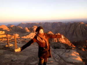 نواصل الصعود، متتبعين قدم من يسبقنا، فلا مكان يكفي لتشابك الأيدي، وتنعدم الرؤية تماما، الضوء الوحيد يأتي من ملايين النجوم التي تطل قريبة منا. يعجز البعض عن مواصلة الصعود، فيستبقيهم المرشد في واحدة من الاستراحات رفقة مجموعة من البدو، ريثما نعود. تجمدت الموبايلات مثل أطرافنا، وفقدنا تماما الاتصال ببعضنا وبالعالم الخارجي..تكثر الشكوى من المجموعة، ويطمئنا المرشد بأننا اقتربنا من “السلالم” التي تؤدي إلى القمة حيث سنشهد شروق الشمس..فتدب فينا روح الأمل ونواصل السير على أمل الوصول إلى “السلالم”..
