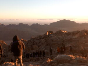 كنا في خط البداية، أمام نقطة تفتيش، يتأكد فيها المسئولون من شخصياتنا، ووجود مرشد معنا، والمرشد هنا، لابد أن يكون من أهل سيناء، وسانت كاترين بالتحديد، ولذلك هناك لافتة باللغة العربية ولغات أخرى أجنبية تحذر من القيام برحلة الصعود من غير مرشد من البدو.. وكان مرشدنا من قبائل الجبالية، ومن غيرهم يحفظ الجبل؟! برودة الجو الشديدة جعلتنا نغطي وجوهنا بالكوفيات الصوفية والأقنعة، ولم يعد هناك مجال لرؤية أو لمعرفة من يسير إلى جانبك. الأنظار مركزة على الأرض، نتتبع نقاط الضوء، ونتفادى التعثر على الطريق الممتد نحو الجبل..تسير المجموعة في الطريق الصخري أو “المدق”، واحدا خلف الآخر. اتفقنا على نداء نتجمع فورا عند سماعه لنتأكد أننا في نفس المجموعة وفي نفس الاتجاه..امتد المدق لما يزيد عن 7 كيلومترات، ونحن نجاهد البرد الشديد، والظلام الدامس، ووعورة الطريق..نتجه نحو جبل موسى، أشهر جبال سيناء، ومن أعلاه سنشهد شروق الشمس على جبل سانت كاترين المجاور له، ودير سانت كاترين، الذي سنزوره بعدما ننتهي من رحلة الصعود نحو القمة…