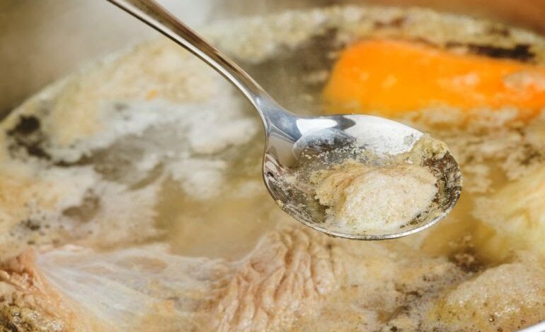 في هذا التقرير نتحدث عن إحدى الخطوات الأساسية عند تحضير اللحوم والدواجن المسلوقة، وهي إزالة الرغوة البيضاء عن الشوربة أثناء التحضير، ولماذا تحدث تلك الرغوة؟ وما أسبابها ومخاطرها؟ كما نستعرض علامات تلف اللحم التي يجب مراقبتها عند تحضير الطعام لتجنُّب أي تبعات صحية خطيرة.