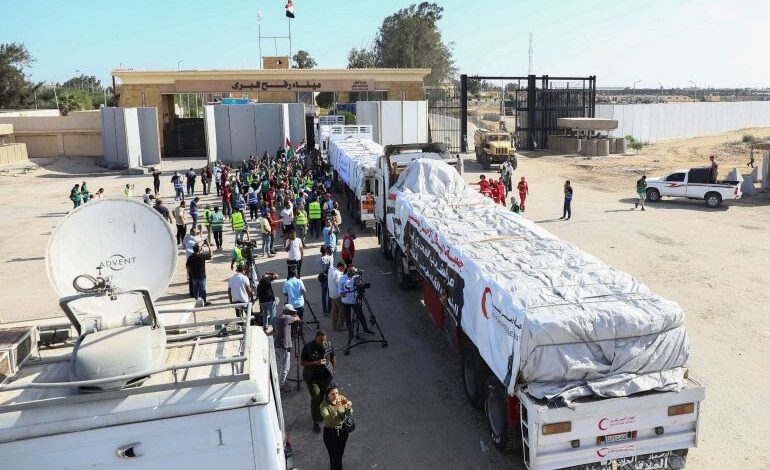 وكان من المقرر ان تعبر قافلة ثانية من المساعدات إلى قطاع غزة عن طريق معبر رفح الحدودي مع مصر، وتضم القافلة 17 شاحنة من المفترض أن تدخل القطاع بعد تفتيشها.