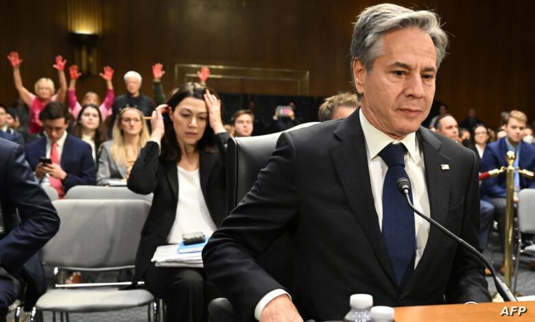 Anti-war protesters raise “bloody” hands behind Blinken at hearing on Capitol Hill in Washington
