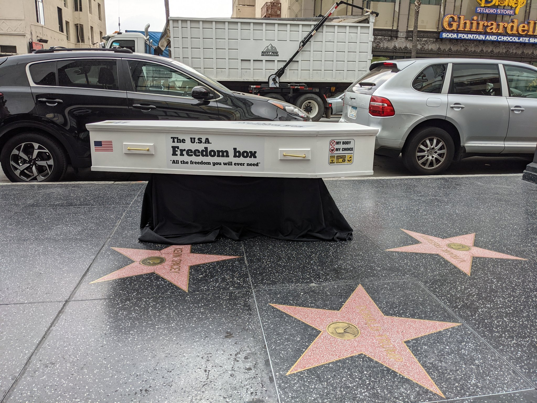 فنان أمريكي يصنع تابوتاً ويضعه فوق نجمة ترامب في ممر المشاهير بهوليوود احتجاجاً على وفيات كورونا في الولايات المتحدة ورفض…