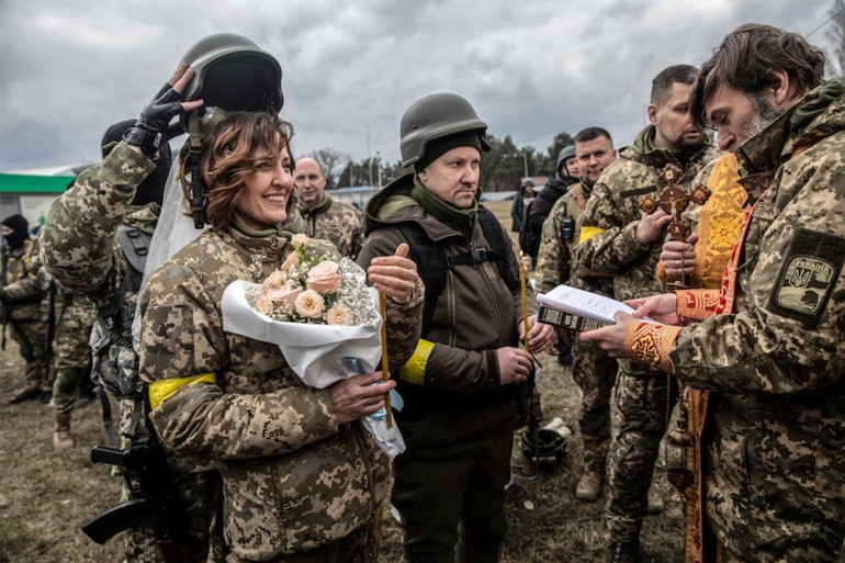 حفل زفاف في أوكرانيا.. العروس ترتدي زيا عسكريا والحضور يحملون الأسلحة